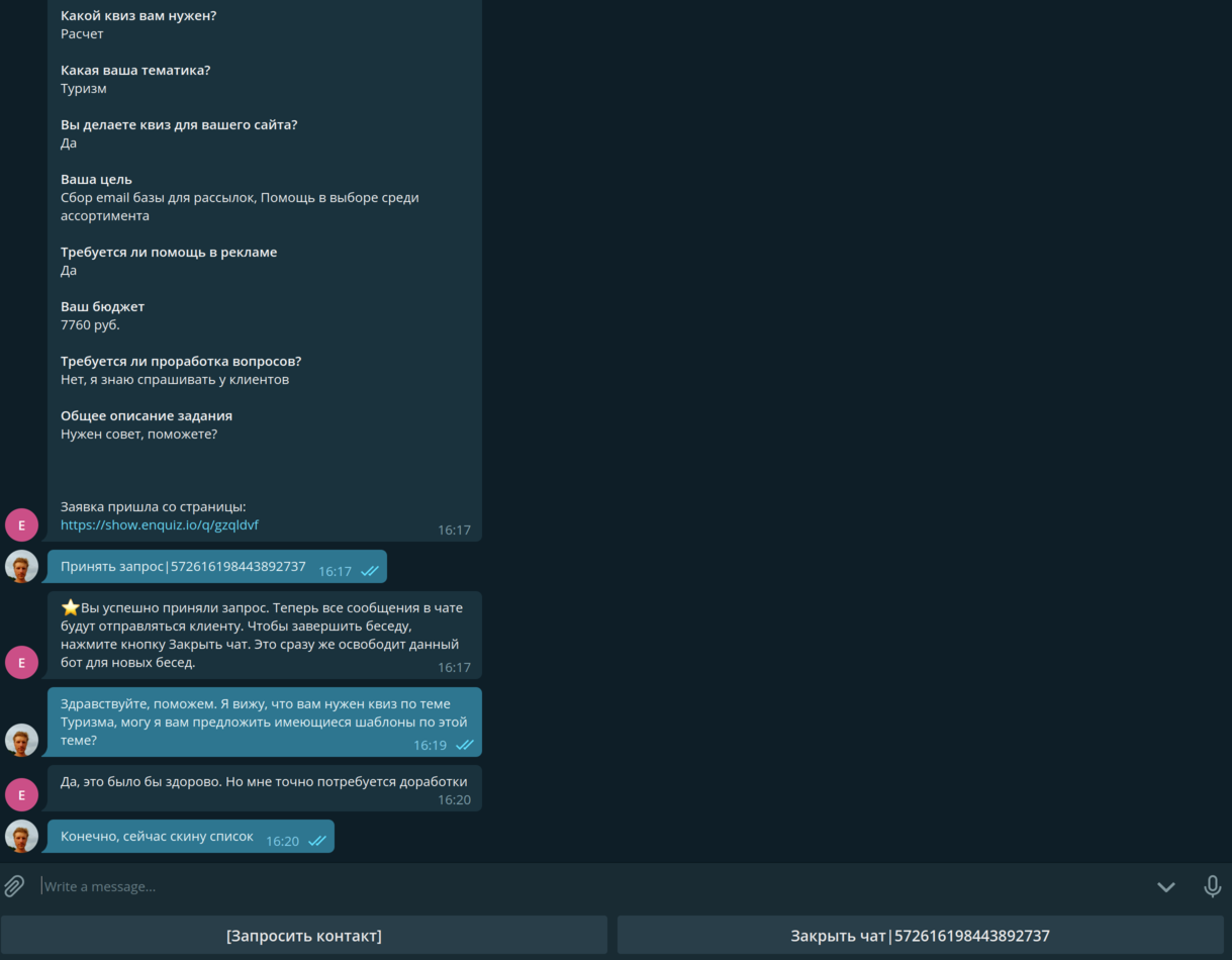 - если вы не можете в данный момент вести беседу, то квиз будет работать в стандратном режиме без чата, т.е. просто спросит контакты