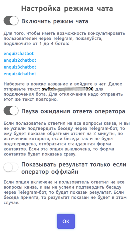 - Включить режим чата для выбранного квиза в списке квизов, нажав на кнопку Telegram консультант и включить первый переключатель. Нажмите ОК внизу.